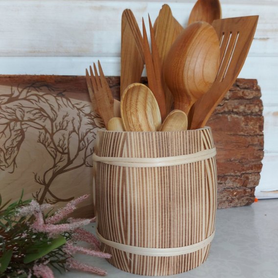 - Beczka (wysokość ok. 16 cm, średnica u góry 14,3 cm, grubość ścianki 1,2 cm, obwód ok. 49,5 cm) - stylowy pojemnik na wszystkie akcesoria, który zapewnia porządek w kuchni.