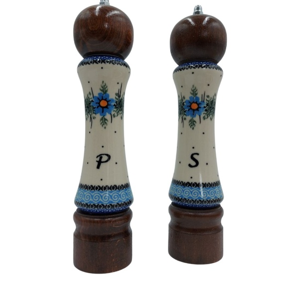 Stylowy zestaw dwóch jasnych młynków do przypraw to połączenie naturalnego drewna i ręcznie malowanej ceramiki. Dzięki eleganckiemu, naturalnemu wykończeniu młynki świetnie pasują zarówno do klasycznych, jak i nowoczesnych kuchni. To funkcjonalne narzędzie i dekoracyjny element w jednym – idealne do codziennego gotowania i efektownego serwowania dań.